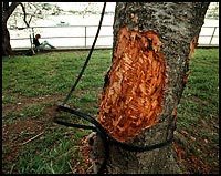 Of course, we're talking about the TIDAL BASIN BEAVER, who at last reckoning had stepped up his terrible assault on a great national treasure, the magnificent Japanese CHERRY TREES that ring the TIDAL BASIN, site of the JEFFERSON MEMORIAL, heedless of our pitiable efforts to stop him. Like SLOBODAN MILOSEVIC, he's turned all Washington into a cauldron of impotent fuming and has gone about doing just about whatever he wants to do; while everyone frets that he must be stopped, his destruction continues unabated. And just as our military brass and their elected overlords have limited their look-ma-no-casualties air war to secondary "support"